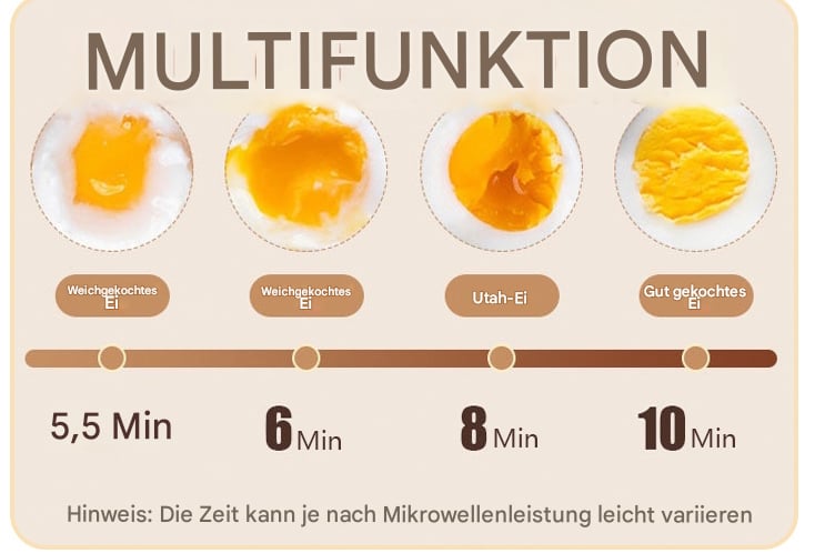 - Einfach zu verwenden: Die Verwendung ist ganz einfach: Sie müssen lediglich die Eier in den Kocher geben und den Kocher in die Mikrowelle stellen.