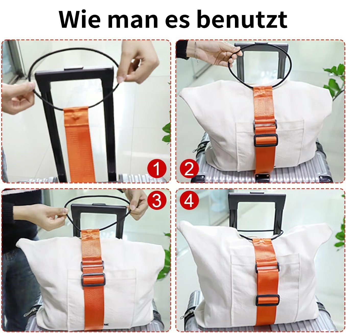Anwendung Nutzen Sie die Tasche als Reisetasche mit Schiebegriff. Befestigen Sie das Gummiband an einer Seite des Schiebegriffs. legen Sie das Gepäck auf den Gurt und hängen Sie das andere Gummiband an den Griff. Alternativ können Sie die Gummibänder an beiden Griffen befestigen und zusätzlich eine Stola oder eine kleine Tasche am Gurt anbringen. Bei Nichtgebrauch lässt sich die Tasche platzsparend verstauen. Ein elastischer Gepäckgurt ist daher ein praktischer Reisebegleiter.